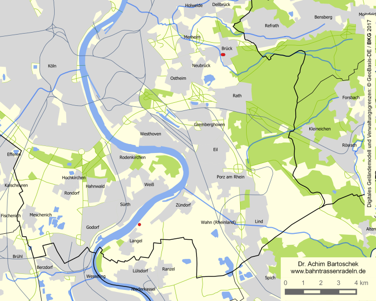 Ursprüngliche Bewertung: Im rechtsrheinischen Kölner Stadtteil Brück sowie bei Langel stehen wenige Wischenwegweiser mit schwarzem Rahmen und grünem Fahrradpiktogramm und Pfeil.