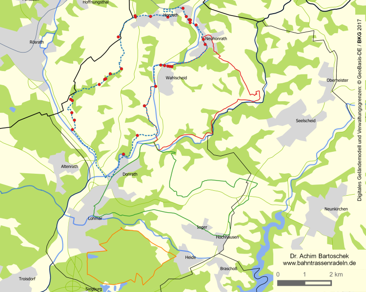Ursprüngliche Bewertung: Die 22 km lange "blaue" Route ist der Vorläufer der 2017 im Rahmen des Lokalen Netzes Lohmar eingerichteten Höhen-Route (2). Beide Routen sind deckungsgleich; die abschnittsweise noch häufig anzutreffenden HBR-ähnlichen Altwegweiser mit blauen Richtungspfeilen sollten zur Vermeidung unerwünschter Doppelbeschilderungen vollständig entfernt werden. Dies betrifft insb. die Teilstrecken, die als Knotenpunktrouten der RadRegionRheinland neu ins nach HBR beschilderte Netz übernommen wurden.