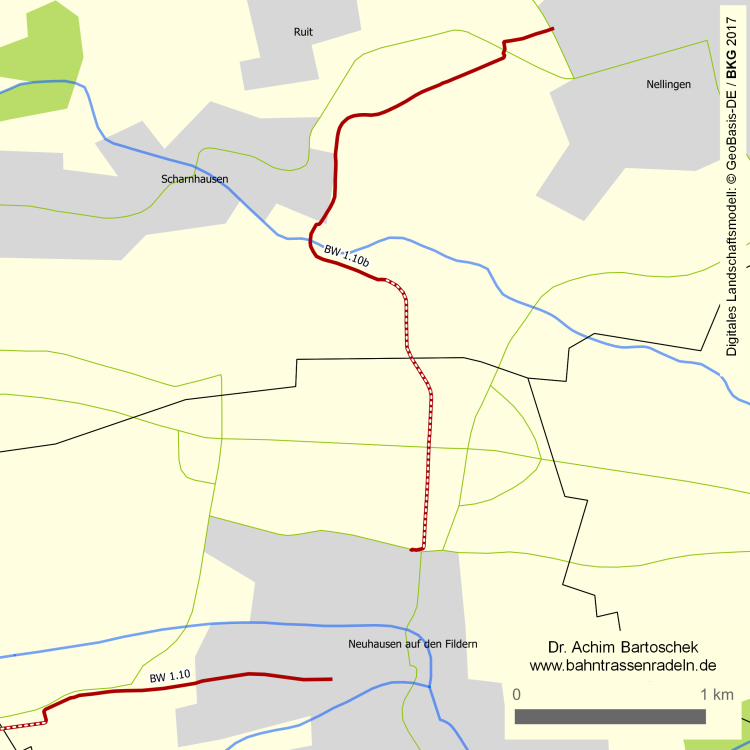 Streckenlänge (einfach): | ca. 4,1 km (davon ca. 1,5 km auf der ehem. Bahntrasse) der Weg verläuft zwischen Scharnhausen und Nellingen unmittelbar neben der Trasse |