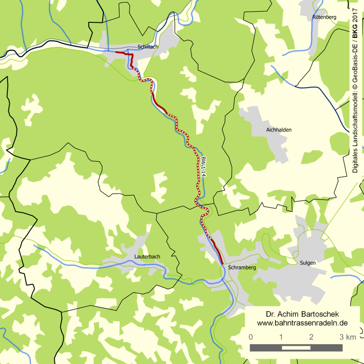 Schiltach-Straße in SCHRAMBERG; am ehem. Bahnhofsgelände vorbei (z. T. überbaut: Supermärkte); bei 0,3 geradeaus folgen, später linker R/F |