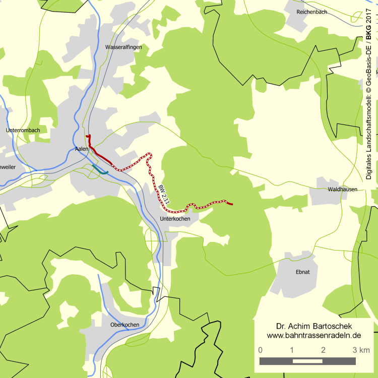 Streckenlänge (einfach): | ca. 7,3 km (davon ca. 5,7 km auf der ehem. Bahntrasse) Hbf Aalen – oberhalb Unterkochen |