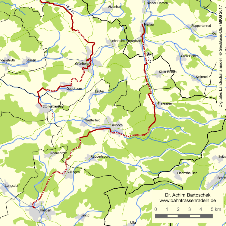 | Streckenlänge (einfach): | ca. 26,5 km (davon ca. 18,3 km auf der ehem. Bahntrasse) zwischen Hungen und dem Laubacher Wald weitestgehend auf der ehem. Bahntrasse und ca. 4 km zwischen Mücke und Stockhausen (davon ca. 1,9 km auf der Trasse, z. T. als straßenbegleitender Radweg zur B 276) |