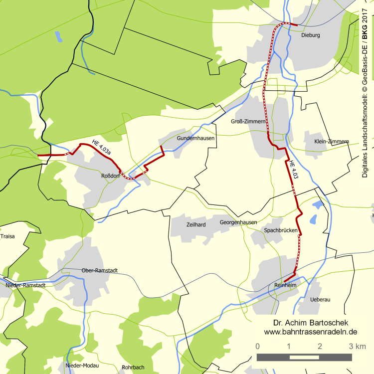 Die Radroute zwischen Dieburg und Reinheim verläuft etwa zur Hälfte auf der ehemaligen Rodgaubahn, die insbesondere im südlichen Teil von Groß-Zimmern überbaut ist. |