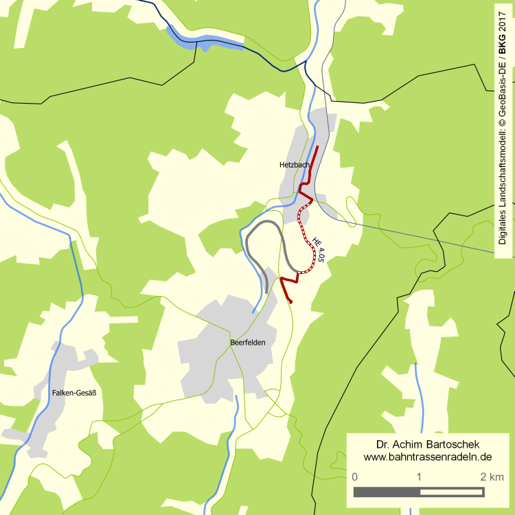 Nur ein Stück der früheren Stichbahn nach Beerfelden konnte als Radroute genutzt werden. Für das längere Endstück hätte eine Lösung für die Querung der Bundesstraße gefunden werden müssen. |