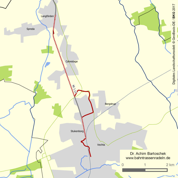 Zwei relativ kurze Abschnitte der Bahnstrecke Ahlhorn – Vechta, deren Niedergang mit dem Bau der Autobahn begann, sind zu einem komfortablen Radweg ausgebaut. |