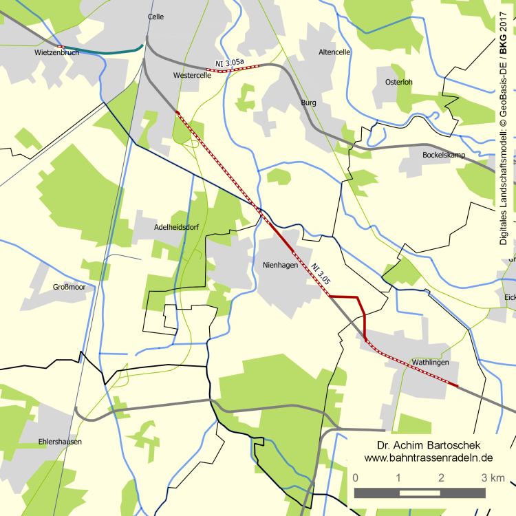0,0 Der Bahntrassenradweg NI 3.05 hat direkten Anschluss an den Weser-Elbe-Weg (Radfernweg 12 des N-Netzes; noch ohne Einschübe mit Routenlogo) |