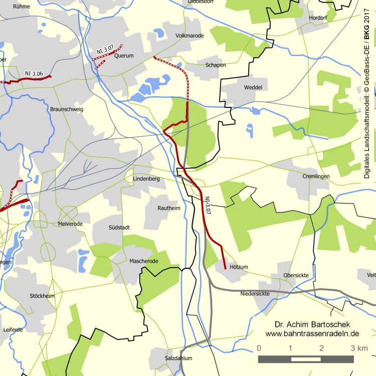 bei 2,8 die BAB 39 unterqueren: Schöppenstedter Turm / L 625 (linker R/F); am ehem. Bahnhof Rautheim vorbei