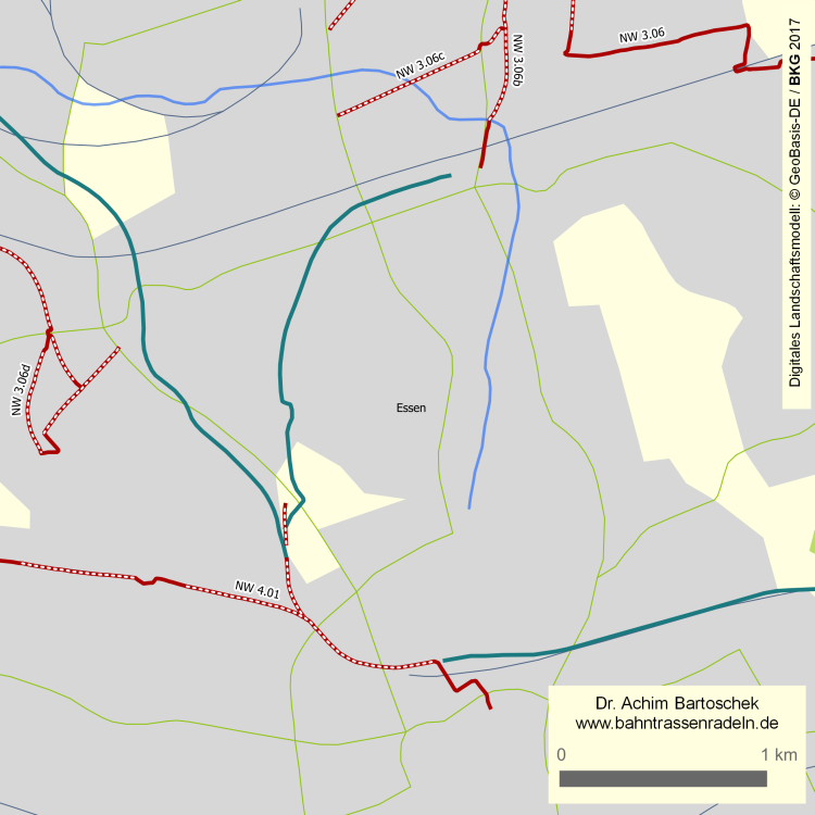 Radwegebau: | Zwischen der Pferdebahnstraße an der Rheinischen Bahn (NW 4.01) und dem S-Bahnhof Altenessen wird die im Vergleich zur Krupp-Bahn (NW 3.06e) etwas weiter östlich liegende Trasse sukzessive ebenfalls zu einem Radweg ausgebaut. Im Programm "ESSEN.Neue Wege zum Wasser" wird das Vorhaben nach einer kurz parallel verlaufenden Straße als "Grünzug Zangenstraße" geführt. Der erste rund 650 m lange Abschnitt mit einem Brückenneubau über die Pferdebahnstraße zur Anbindung an die Rheinische Bahn dient auch Anbindung des künftigen Radschnellwegs Mittleres Ruhrgebiet (NW 3.06e) an den Radschnellweg RS1. Im November 2017 wurde die alte Brücke über die Pferdebahnstraße abgerissen; an ihrer Stelle entstand 2018 eine neue Stahlbetonbrücke mit größerer Durchfahrthöhe. Die Brücke und 700 m Radweg wurden am 2. November 2018 eingeweiht. Die nächste Abschnitt inkl. einer neuen Brücke über die Bottroper Straße wurde Anfang 2021 freigeschnitten und im August 2023 freigegeben. Die Brücke selbst wurde Ende Januar 2023 eingehoben. Aufgrund einer Straßenbaustelle ist die nördliche Anbindung an den Berthold-Beitz-Boulevard noch nicht nutzbar. |