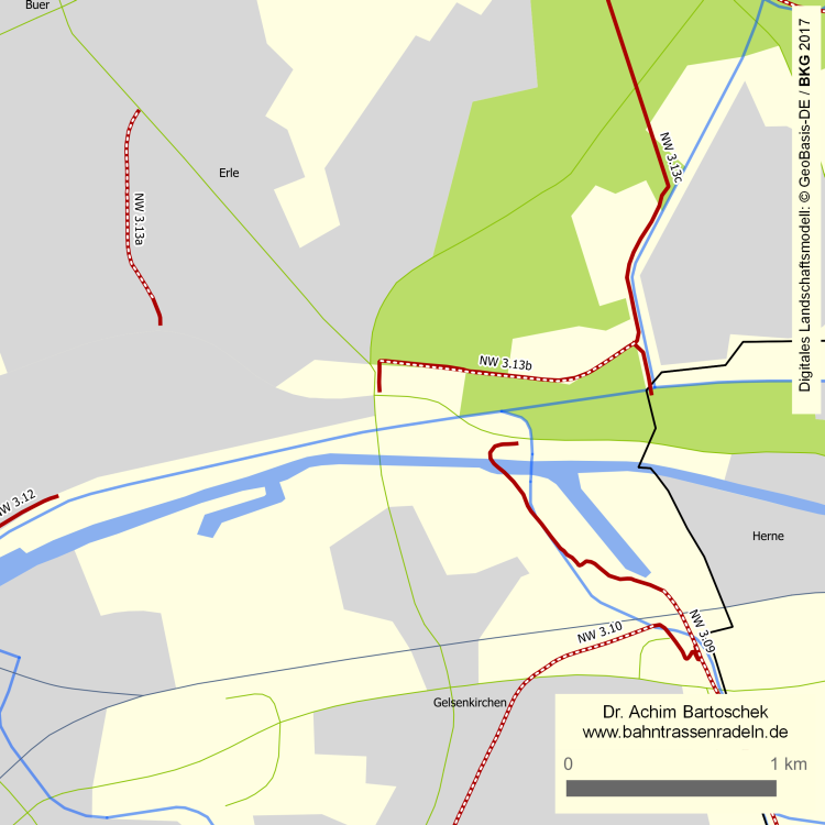 | Streckenlänge (einfach): | ca. 1,4 km (davon ca. 1,3 km auf der ehem. Bahntrasse) Abzweig zum Schacht Emschermulde ca. 500 m |