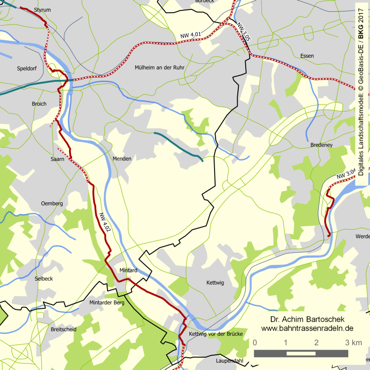 drei kürzere Teilstücke auf der ehem. Bahntrasse mit Verknüpfungsabschnitten Im Bereich des Landesgartenschaugeländes und zwischen Broich und Saarn ist der Bahndamm auf größeren Abschnitten abgetragen, im weiteren Verlauf bis Essen-Kettwig (keine Nutzung als Radweg) ist die Bahntrasse in Mintard überbaut. |