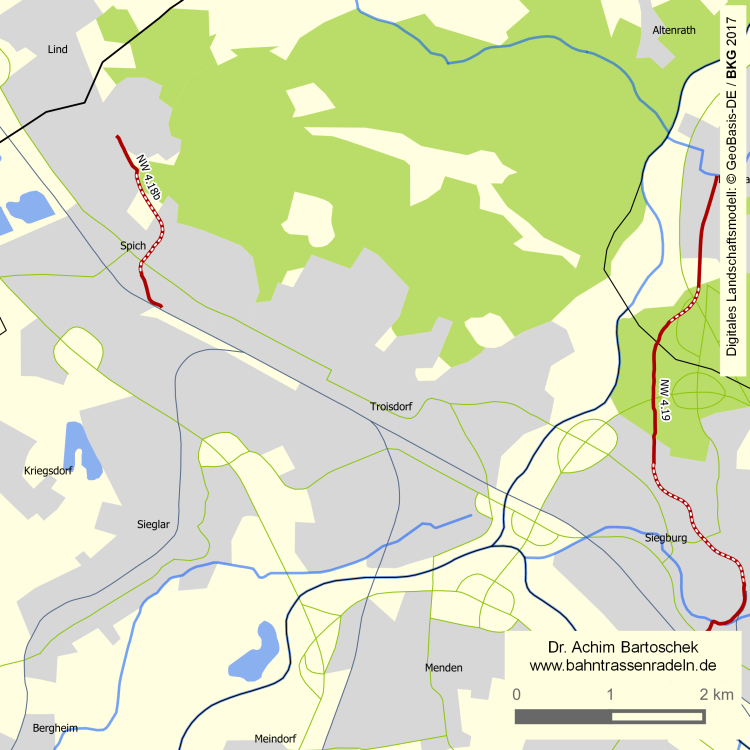 nördlich von Spich vom Kreisverkehr Belgische Allee in südöstlicher Richtung: Mauspfad / K 20 (linker Zweirichtungs-R/F) |