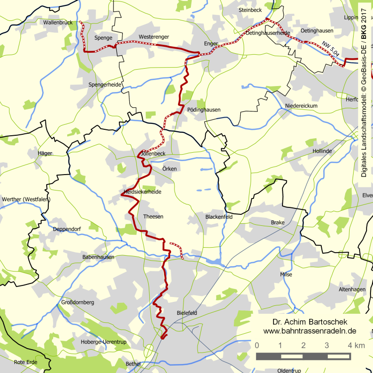 an der Kreuzung rechts: Ringsthofstraße mit Linkskurve; an einer Querstraße wenig rechts versetzt neben die ehem. Trasse der Bielefelder Kreisbahn (wg.), und am Ortsrand bei 3,8 links versetzt auf die Trasse; in einem Einschnitt einen Weg unterqueren |