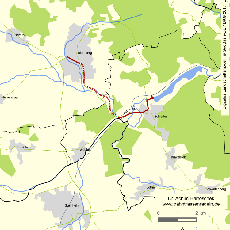 Der reizvolle Weg auf der ehemaligen Stichbahn von Schieder nach Blomberg erspart dem Radwanderer die vielbefahrene Landesstraße. Er ist Teil der BahnRadRoute Hellweg-Weser und des Radverkehrsnetzes Nordrhein-Westfalen. |
