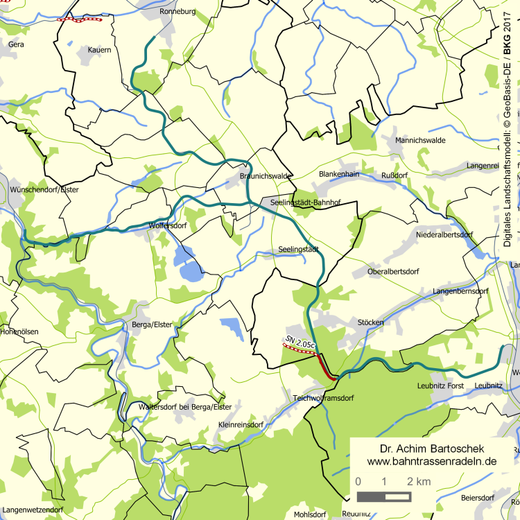 Planungen: | Die "Waldbahn" wurde im Frühjahr 2014 von der Deutschen Bahn an einen Metallverwerter verkauft und sollte abgebaut werden. Die Gemeinden haben ein Optionsrecht und könnten die Trasse anschließend für einen Radweg erwerben. Der sächsische Teil der Bahnstrecke wurde jetzt aber in der Kulturdenkmalliste des Freistaats Sachsen eingetragen, mit der Folge, dass jede bauliche Veränderung genehmigungspflichtig wird. Diese Entscheidung könnte revidiert werden, da der Denkmalwert der Strecke in Thüringen anders beurteilt wird und dort eine [März 2015] |