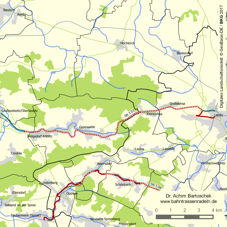 Im Cunewalder Tal ist ein sehr hochwertiger und attraktiver Weg entstanden, der Löbau an den Spreeradweg anbindet und für den im Frühjahr 2017 ein prägnanter Name gesucht wird. Einziger Wermutstropfen ist die unbefriedigende Anbindung Löbaus. |