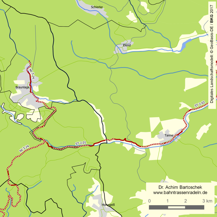 Die von der Südharzeisenbahn (NI 3.24) abzweigende Strecke nach Tanne ist leider nicht mehr vollständig erhalten, sodass man in Niedersachsen kurz auf Bundesstraßen und bei Sorge auf einen parallel verlaufenden Weg ausweichen muss. |