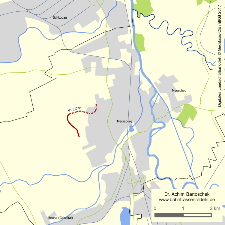 Beginn des wg. Bahntrassenwegs am westlichen Stadtrand von MERSEBURG an der Zufahrt zum Luftfahrt- und Technikmuseumspark: eine Straße überqueren; s. l. Gef.; flacher Einschnitt und flacher Damm; Rechtskurve; später zwei relativ starke Linkskurven |