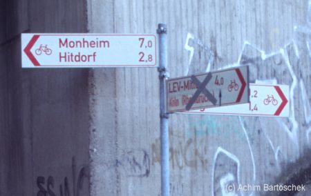 Anhand der auf den Schildern zu findenden Ortsbezeichnungen ist der Radwegweisung in Leverkusen am ehesten anzusehen, dass dieses System mit der Zeit gewachsen ist: Die Zahl verschiedener Schreibungen, Abkürzungen oder gar Ortsbezeichnungen für ein und dasselbe Ziel ist enorm. Allein für das Stadtzentrum (gut, eigentlich gibt es ja kein richtiges) findet man "Lev-Mitte", "Lev.-Mitte", "LEV-Mitte" oder "Leverkusen-Mitte" (jeweils mit und ohne Bindestrich), selten auch Wiesdorf. Einige Schreibungen sind schlicht falsch ("Bergisch-Gladbach").
