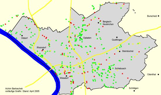 Die erste Erhebung des kompletten beschilderten Radnetzes einer Stadt hatte ich 2004 für Leverkusen im Vorfeld der Landesgartenschau und der damit verbundenen Ausweisung von drei "Stadt-Landschafts-Schlaufen" durchgeführt. Das Netz wurde 2005 mit der Installation des Radverkehrsnetzes des Landes ergänzt und auch in den folgenden Jahren weiter modifiziert. Da hier allerdings die Umsetzung der Knotenpunktrouten der RadRegionRheinland bisher nicht erfolgt ist, wird diese Bestandsaufnahme in Anlehnung an meine Modellregion südlich von Köln erst später aktualisiert.