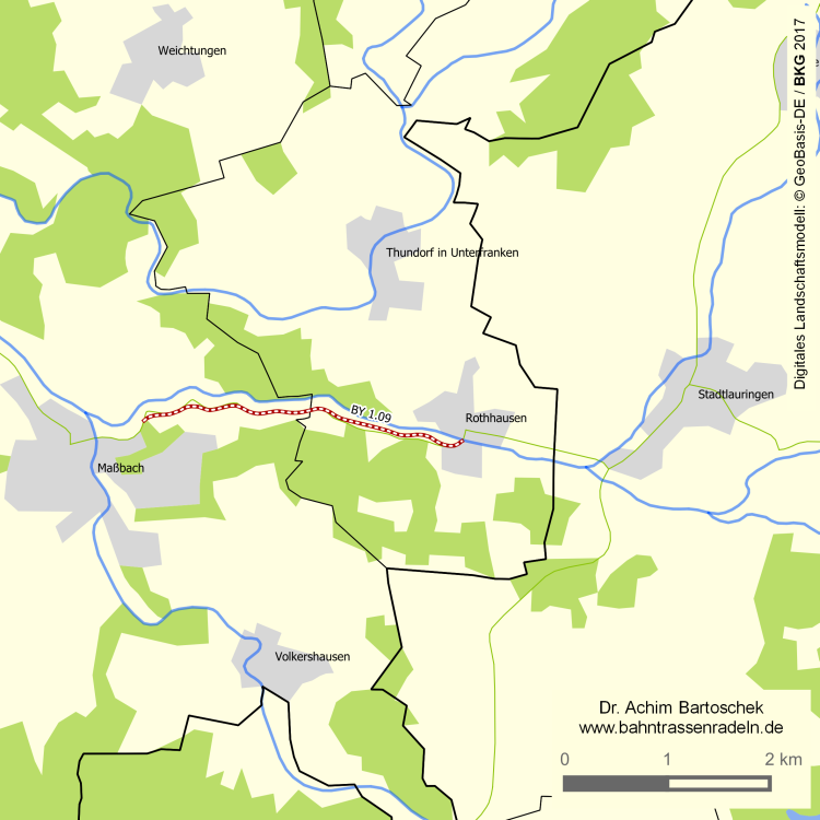 | Radwegebau: | Der Bahntrassenweg kreuzte ursprünglich zweimal die Staatsstraße 2281 von Maßbach nach Rothhausen. Die Straße wurde seit Juli 2014 ausgebaut und begradigt. Dabei wurde bei Maßbach ein Teil des Bahntrassenwegs aufgegeben und der Radweg auf die südliche Straßenseite verlegt. Eine der beiden Querungsstellen befindet sich damit jetzt innerorts. |