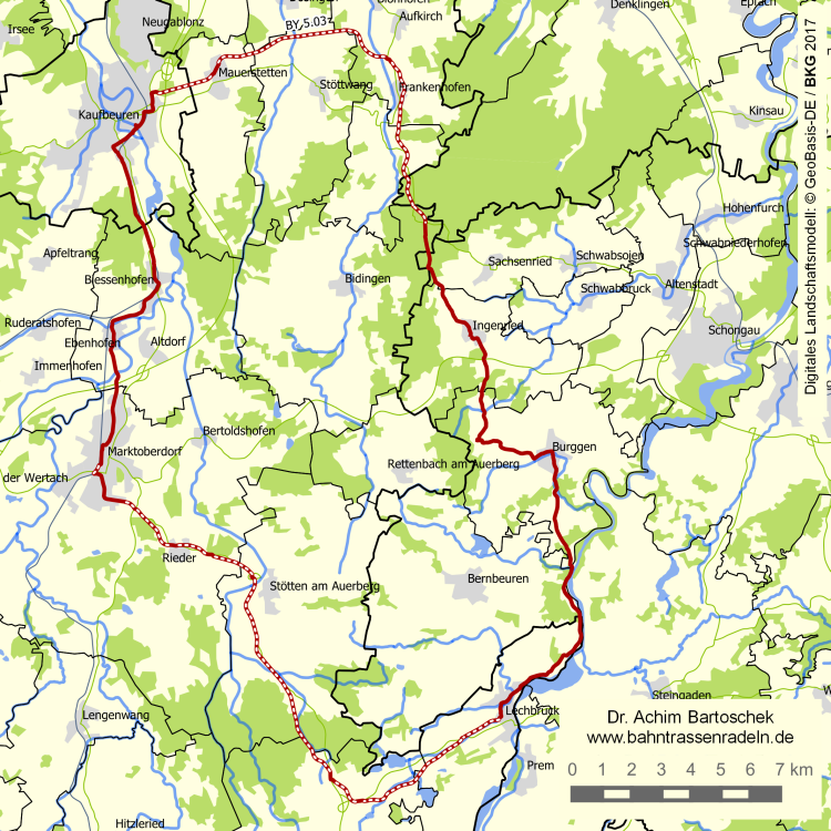 die Abschnitte Kaufbeuren – Sachsenrieder Forst (ca. 17 km) und Lechbruck – Marktoberdorf (ca. 22 km) verlaufen prakt. vollständig auf den Trassen der ehem. Lokalbahnen |