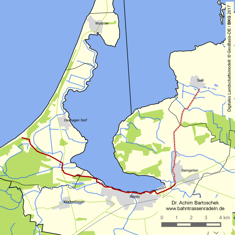 12,9 die ehem. Bahntrasse querte hier die Schillstraße und die B 105 und endete nach 0,9 km am Bf Ribnitz-Damgarten Ost (nicht als Radweg ausgebaut). |