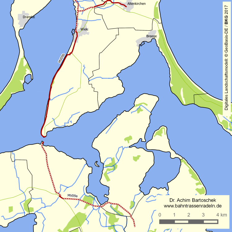 Wittower Fähre – Trent: asph.; Trent – Zirmoisel: unbefestigt, sandig (schwer passierbar) |