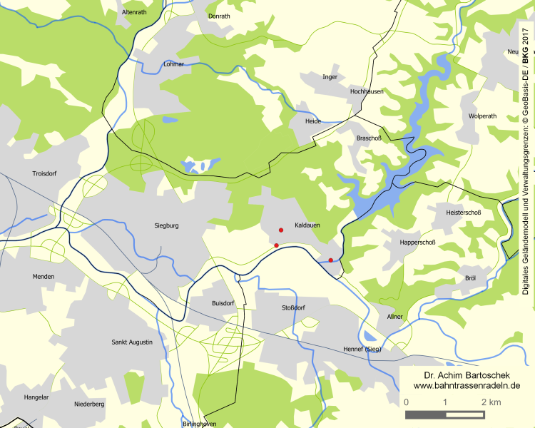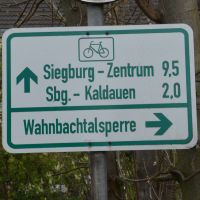 Ursprüngliche Bewertung: Im Südosten Siegburgs verbindet eine Altroute die Stadtteile Kaldauen und Seligenthal. Als westliches Ziel wird Siegburg angegeben; dort wird die Route allerdings nicht wieder aufgegriffen. Hauptaufgabe der Route ist es, Radfahrer um ein Stück der Wahnbachtalstraße (L 316) ohne begleitenden Radweg herumzuführen. Für eine Beschilderung weiterer Abschnitte mit diesem Wegweisungssystem konnten an den Anknüpfungspunkten zum neuen Lokalen Netz Lohmar keine Anhaltspunkte gefunden werden. |
