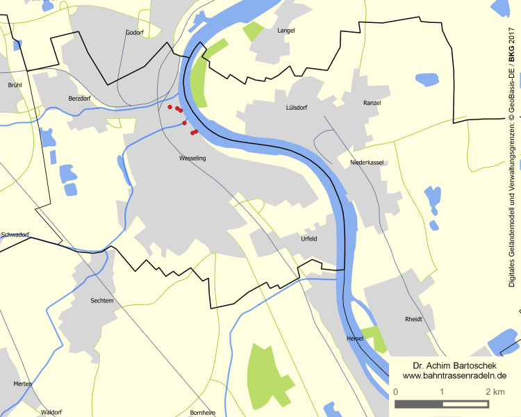 Ursprüngliche Bewertung: Am Nordostrand von Wesseling verbindet eine kleinräumige Alternativroute zum Radverkehrsnetz die Rheinpromenade mit der L 300 in Richtung Köln. Sie ist mit Wegweisern nach Bonn bzw. Köln beschildert. Diese Verbindung ist als Radroute allerdings ungeeignet, da sie über eine steile Treppe (mit Schiebehilfe) führt.